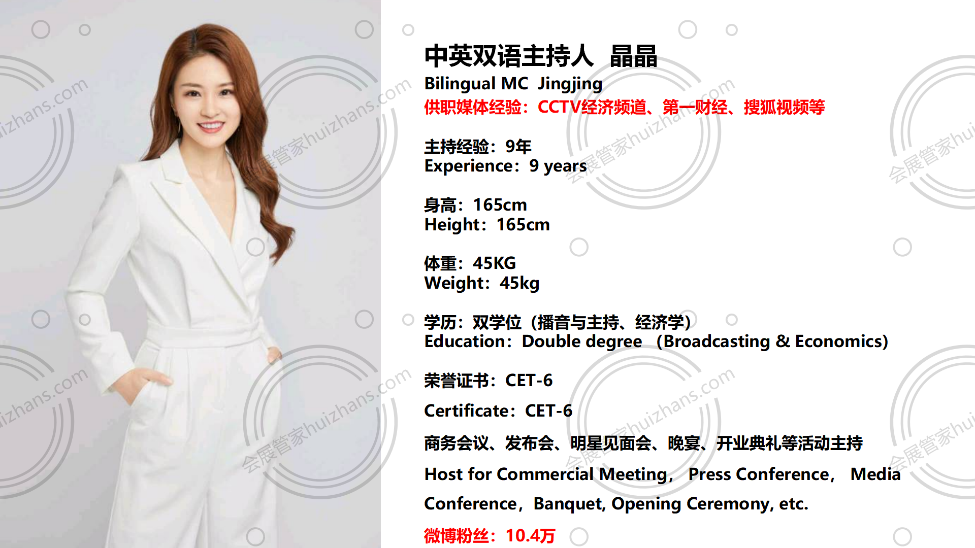 中英双语主持人 晶晶 Bilingual MC Jingjing 供职媒体经验:CCTV经济频道、第一财经、搜狐视频等 主持经验:9年 Experience:9 years 身高:165cm Height:165cm 体重:45KG Weight:45kg 学历:双学位(播音与主持、经济学) Education:Double degree (Broadcasting & Economics)