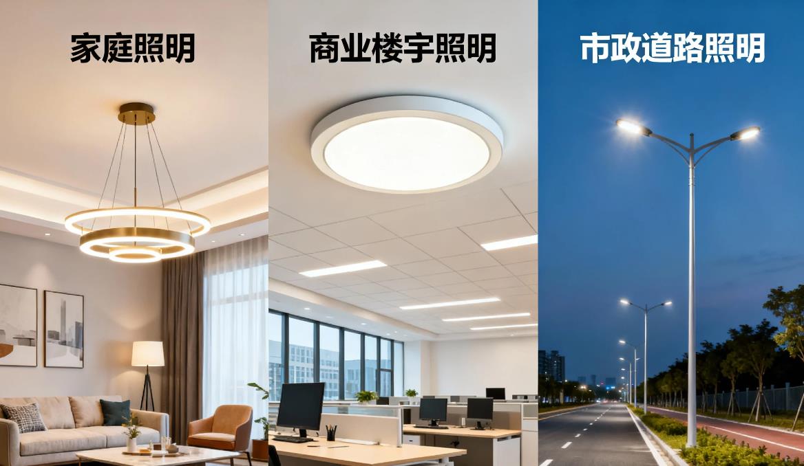 商业照明、装饰照明、户外照明、家居照明、专业及工业照明(舞台灯/隧道灯/医疗照明/车载)、环保照明、道路、工场、背光、其他用照明灯具;